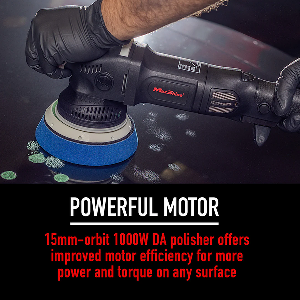- The dual action orbital polisher embraces a 15mm throw with a 5-inch backing plate and 1000W for doing all the hard work